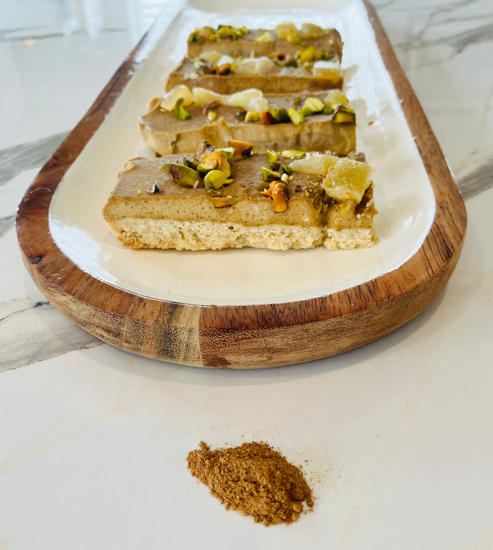 Our Ginger Spice Slice is the healthiest in our range, it starts with a ginger shortbread base, layered with a smooth, lightly spiced cream, and finished with crushed pistachios.